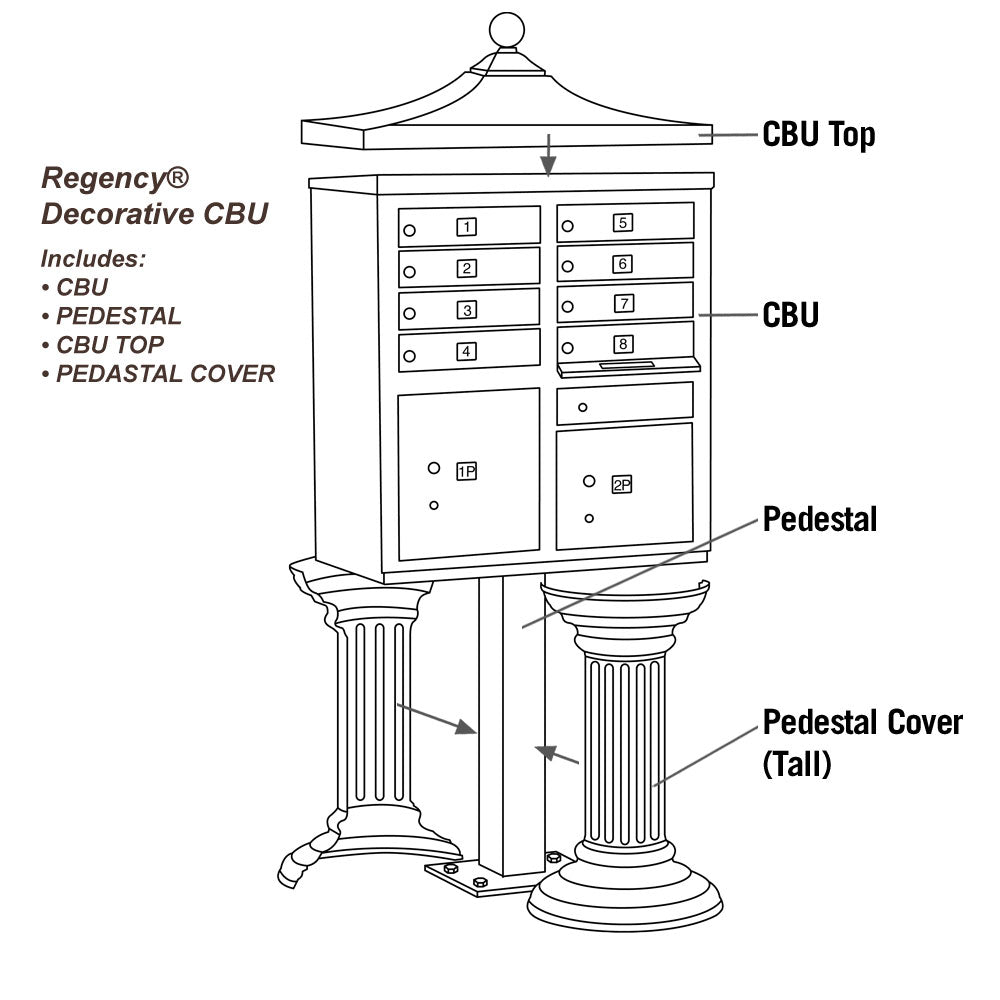 Regency Series12 包括 12 单元 CBU、Regency 装饰顶和 Regency 大型底座包裹。这些配件由重型铝制成,可承受严酷的阳光和天气。配件可轻松安装到 CBU 上,并配有安装硬件。配件采用纹理粉末涂层,经久耐用。有邮政灰、黑色、白色、砂岩、青铜色和绿色可供选择。